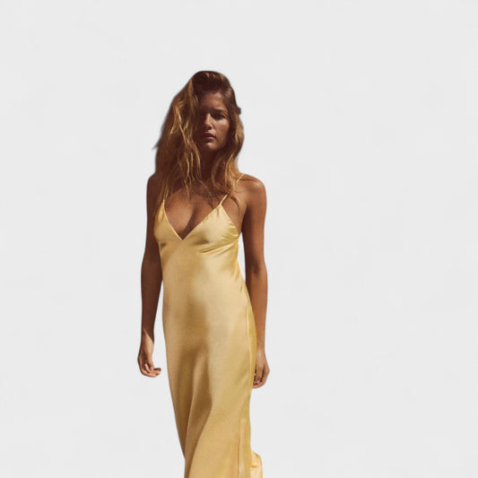 Aby - Vestido Maxi Amarillo Plisado con Escote en V