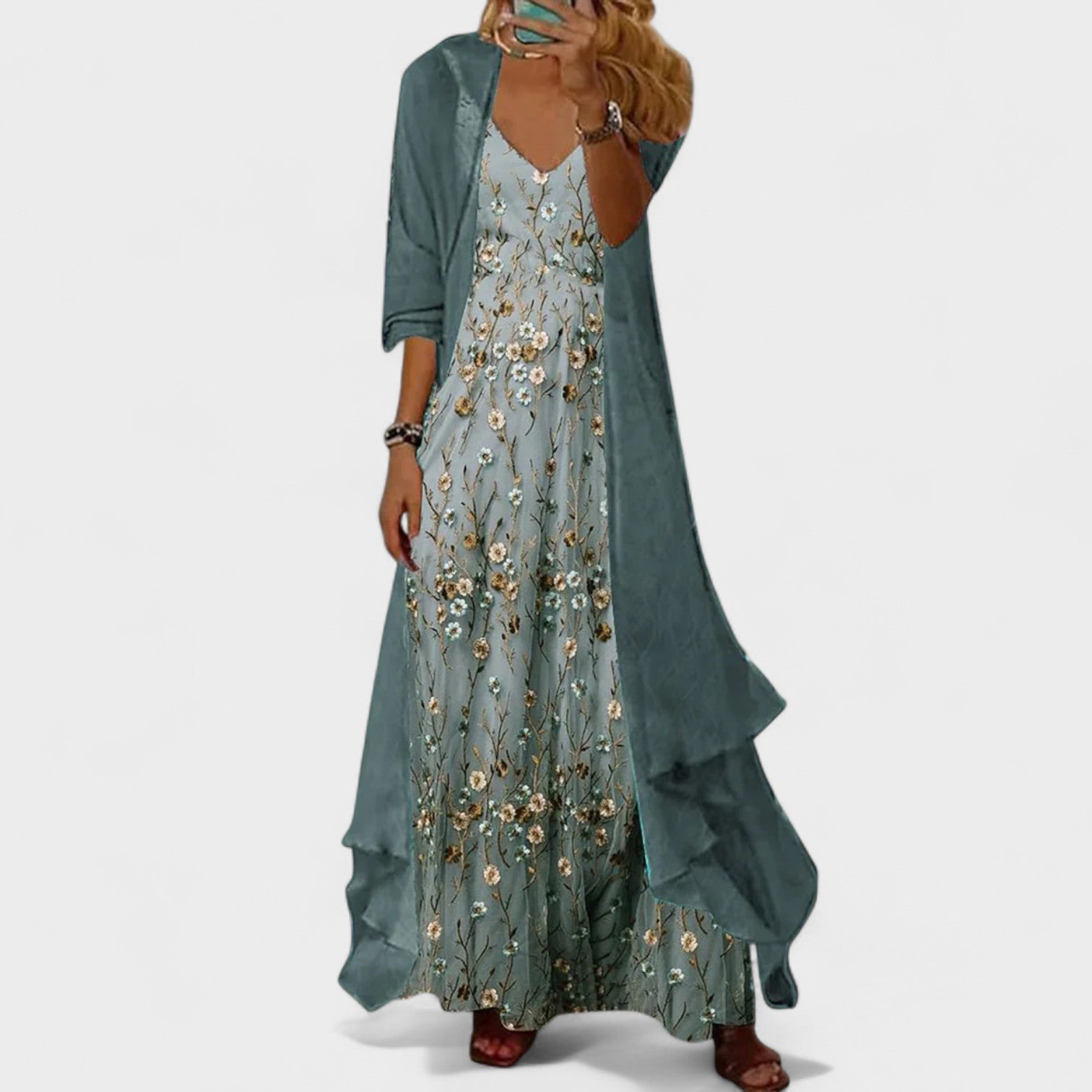 El conjunto Florencia Conjunto Floral combina un vestido largo con estampado delicado y un abrigo ligero, creando una silueta elegante y fluida. Diseñado para ocasiones especiales al aire libre, transmite frescura, feminidad y sofisticación con cada paso.