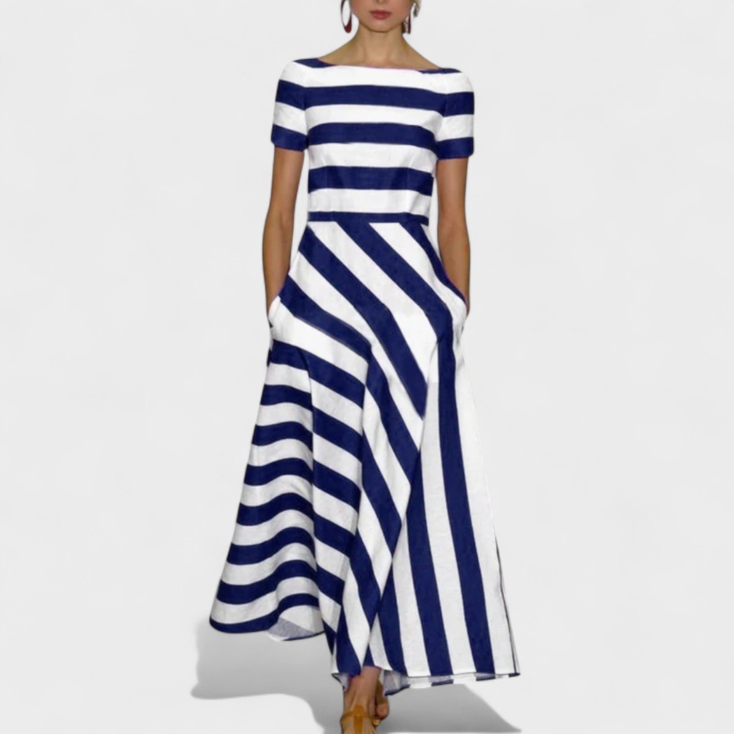 Este vestido midi com listras horizontais e diagonais combina modernidade e sofisticação num design inesperado. O corte estruturado valoriza a silhueta, enquanto os bolsos laterais acrescentam praticidade sem perder a elegância.