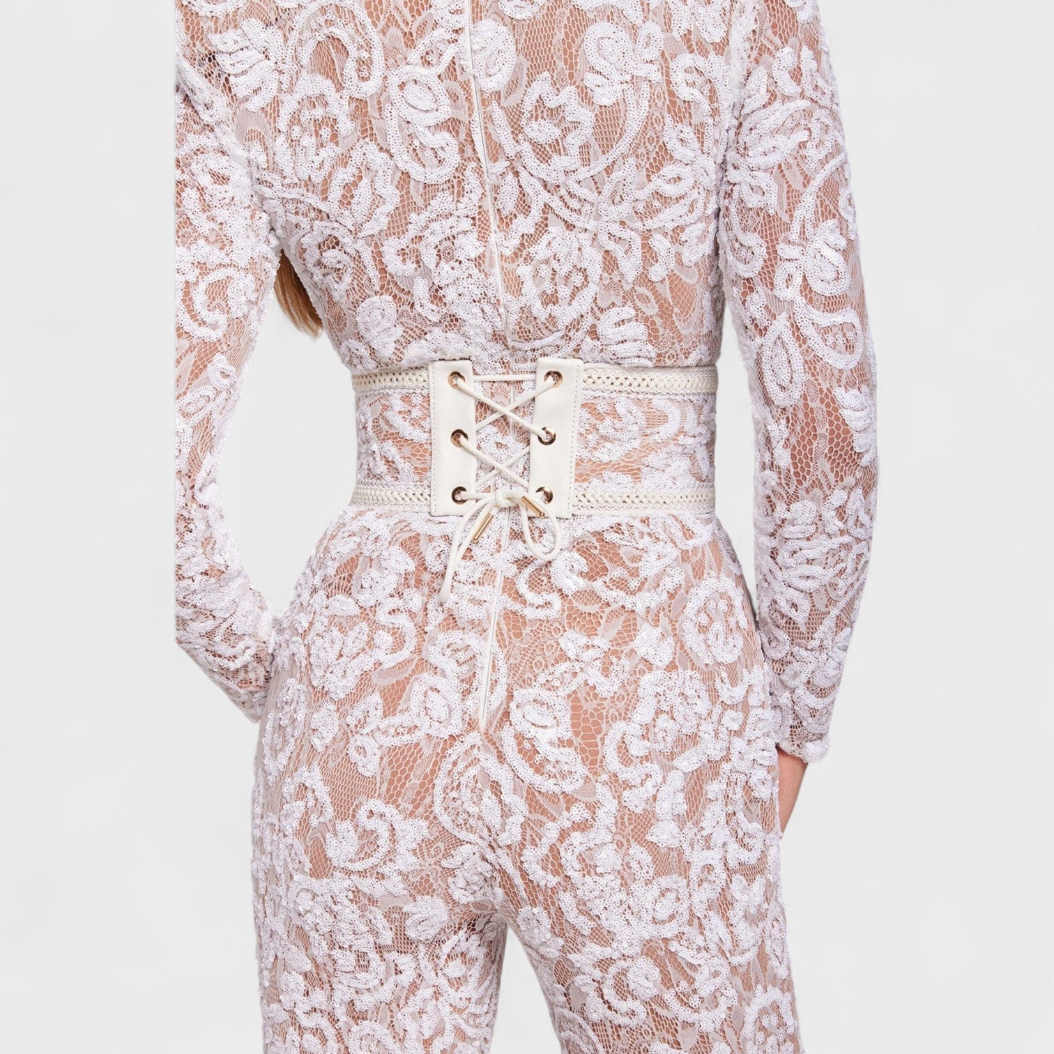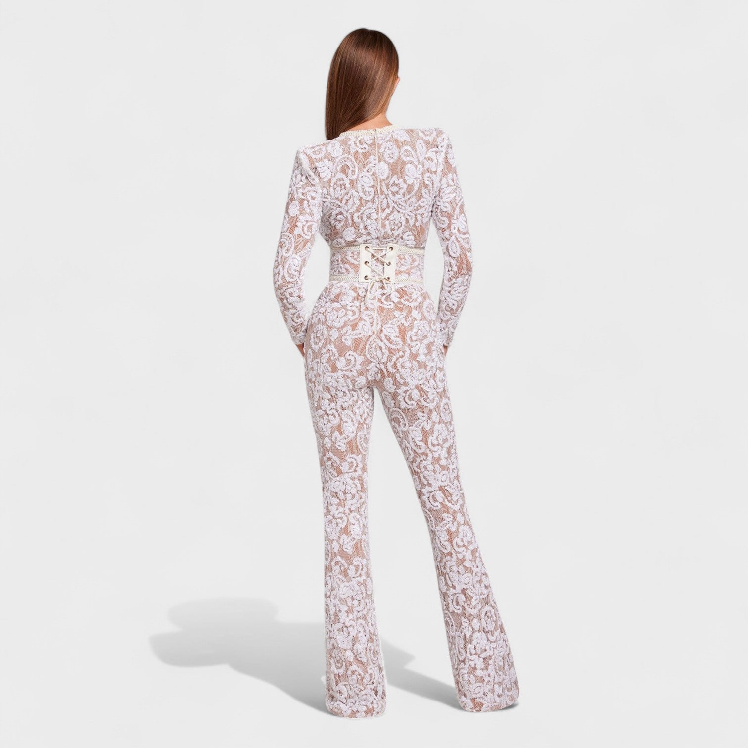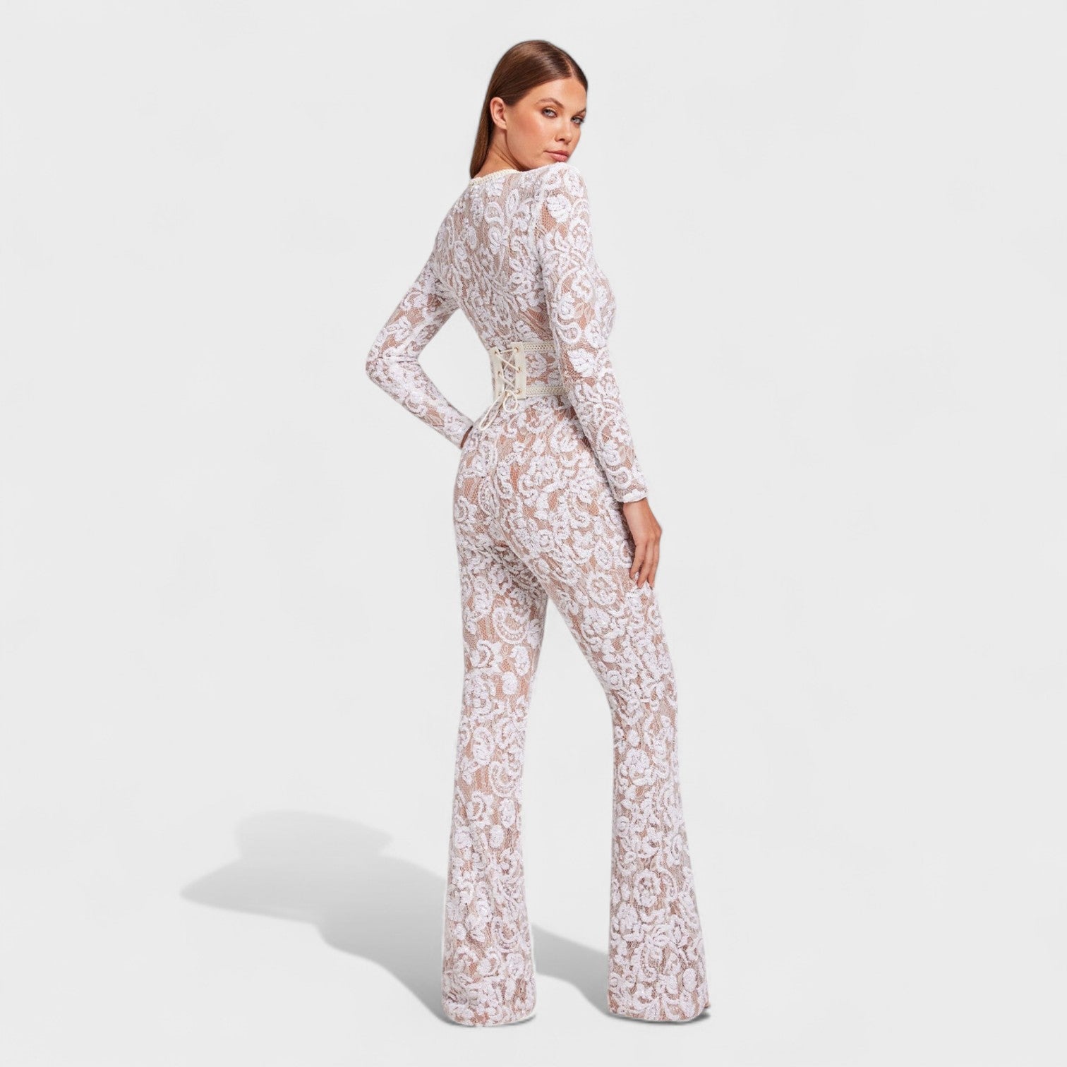 El mono Amelia de RitaBarcelona es una declaración de fuerza femenina. Su encaje floral semitransparente y su cinturón corsé realzan la figura con una mezcla irresistible de elegancia y atrevimiento. Diseñado para mujeres que no temen destacar, ya sea en eventos, fiestas o una noche inolvidable.