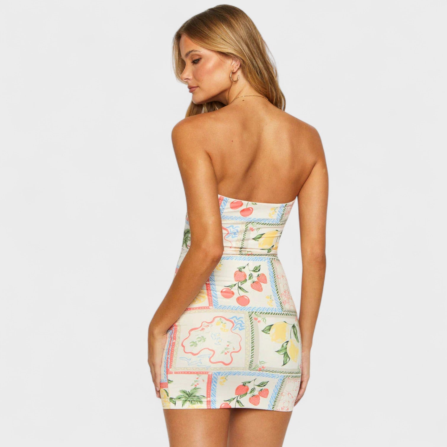 Un vestido mini palabra de honor que combina estampado de frutas mediterráneas con un corte ajustado que resalta tus curvas. Perfecto para cenas junto al mar o paseos con estilo por la ciudad.