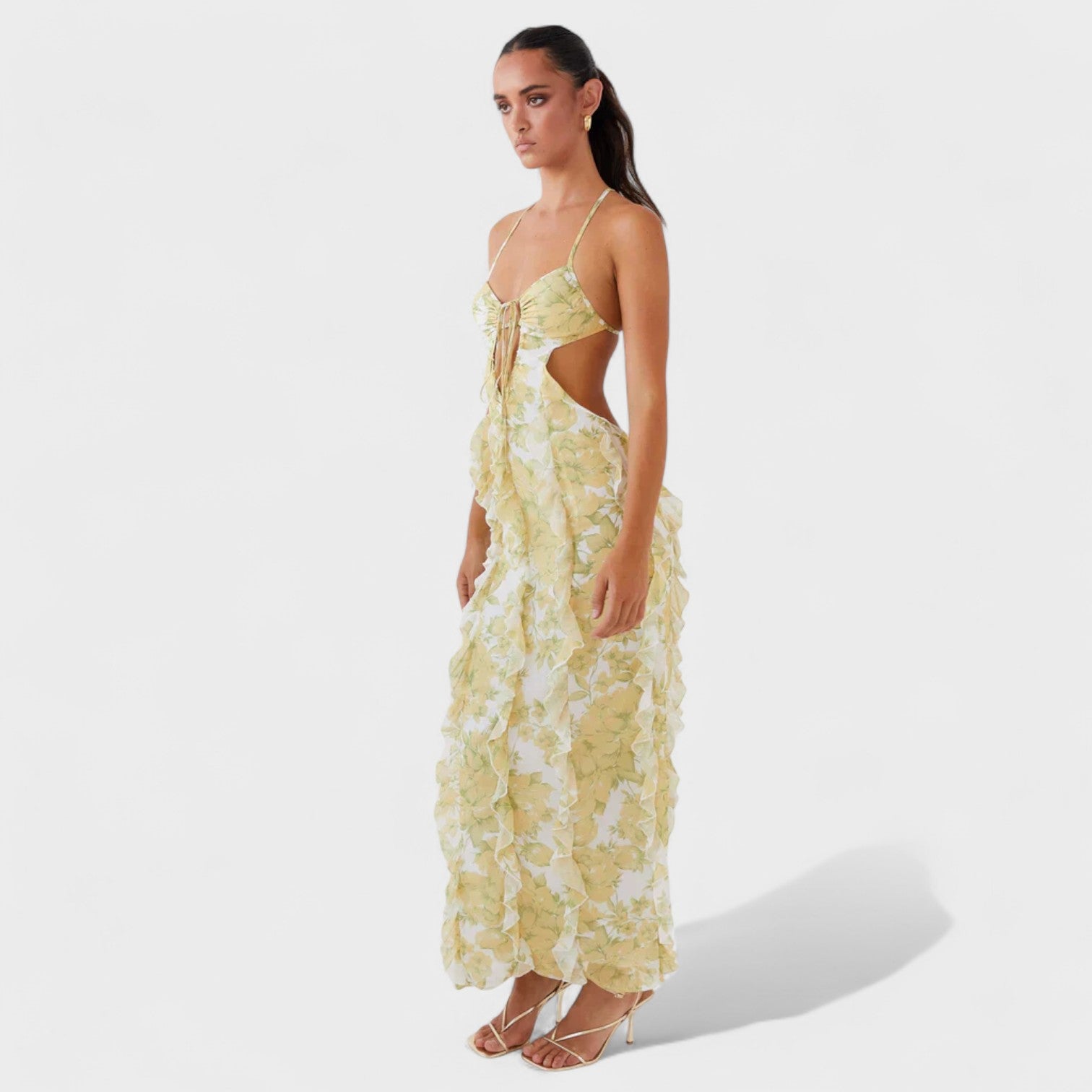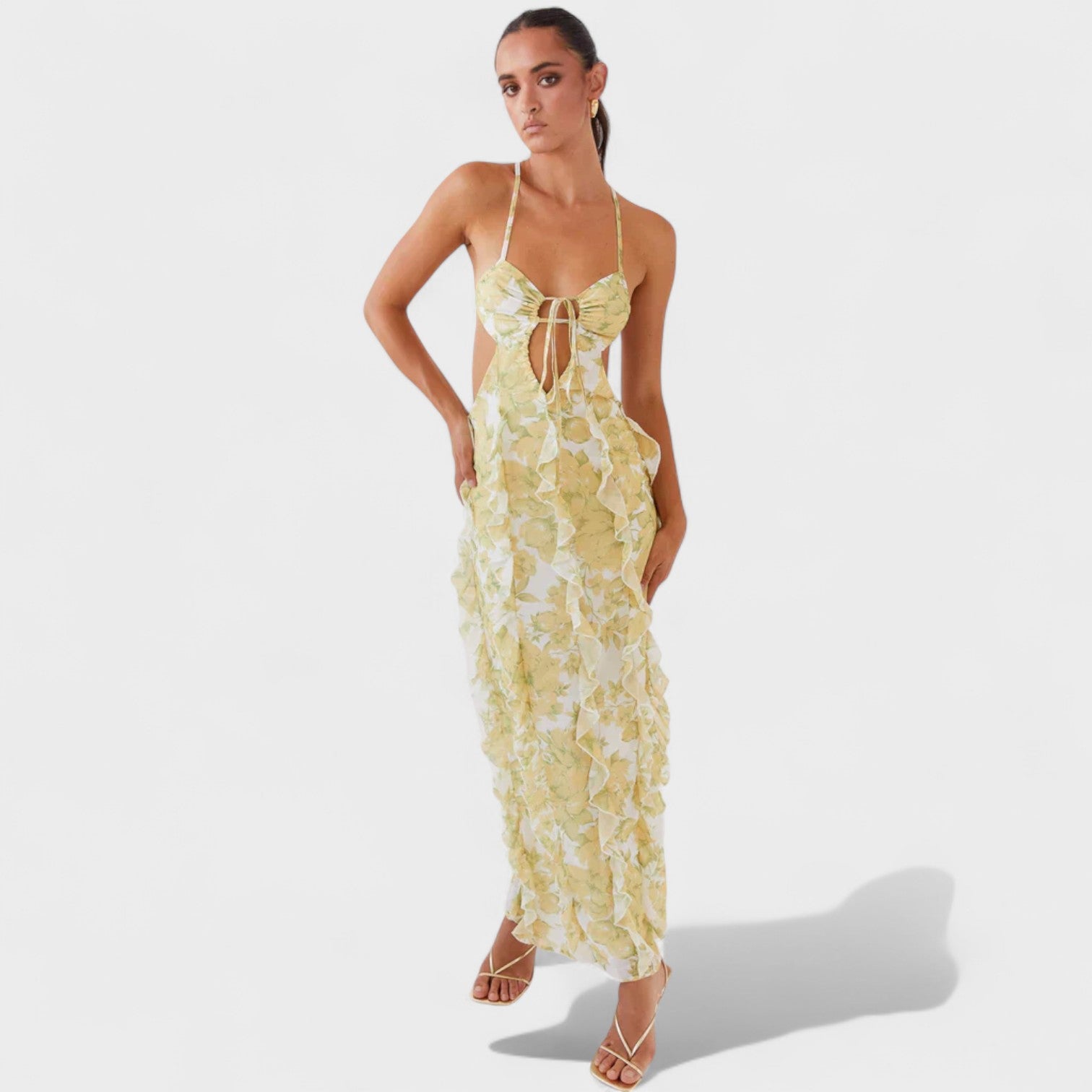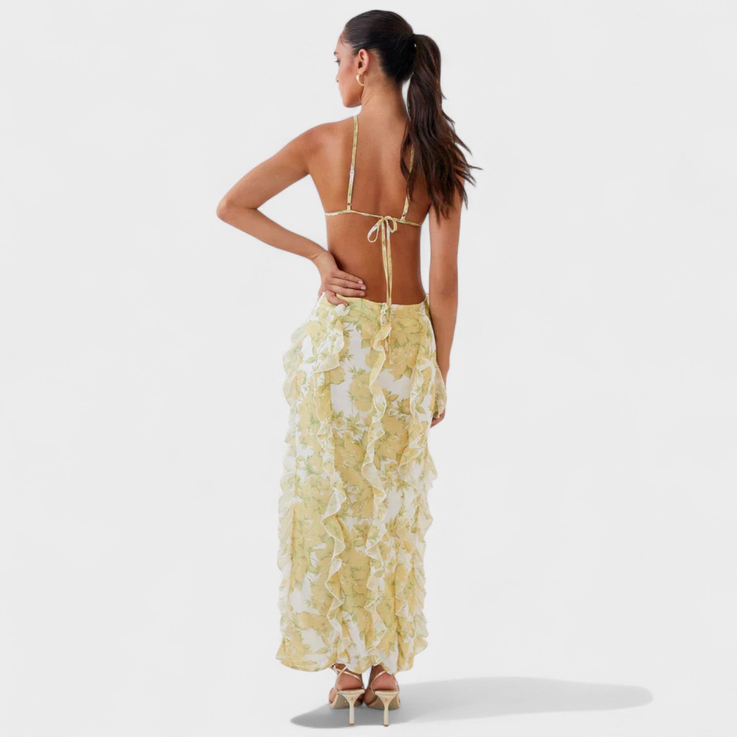 Con un diseño que baila con cada paso, el vestido Sunset Kisses transforma tu silueta en pura poesía visual. Su escote halter ajustable, espalda descubierta y capas de volantes flotantes lo convierten en el protagonista de cualquier puesta de sol.