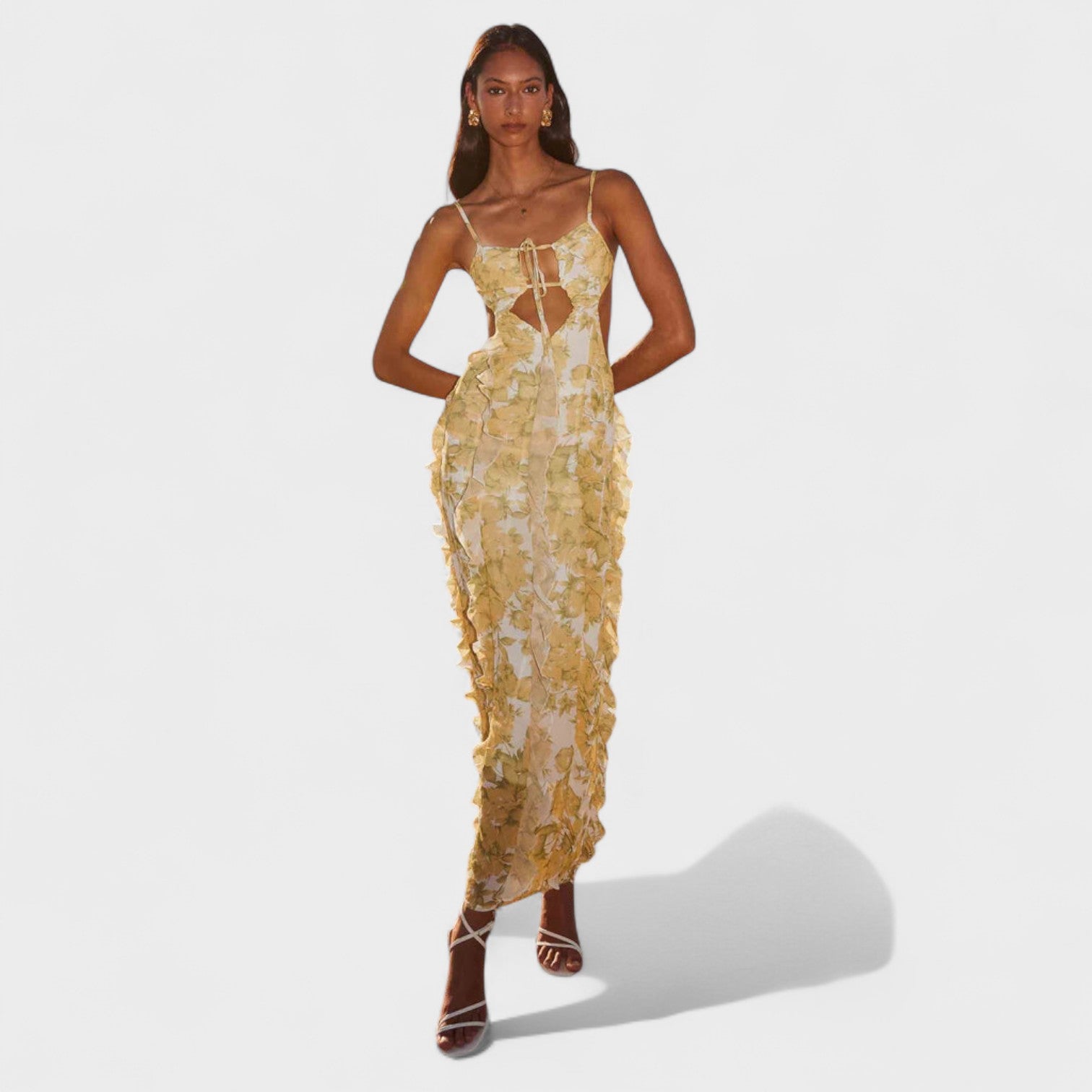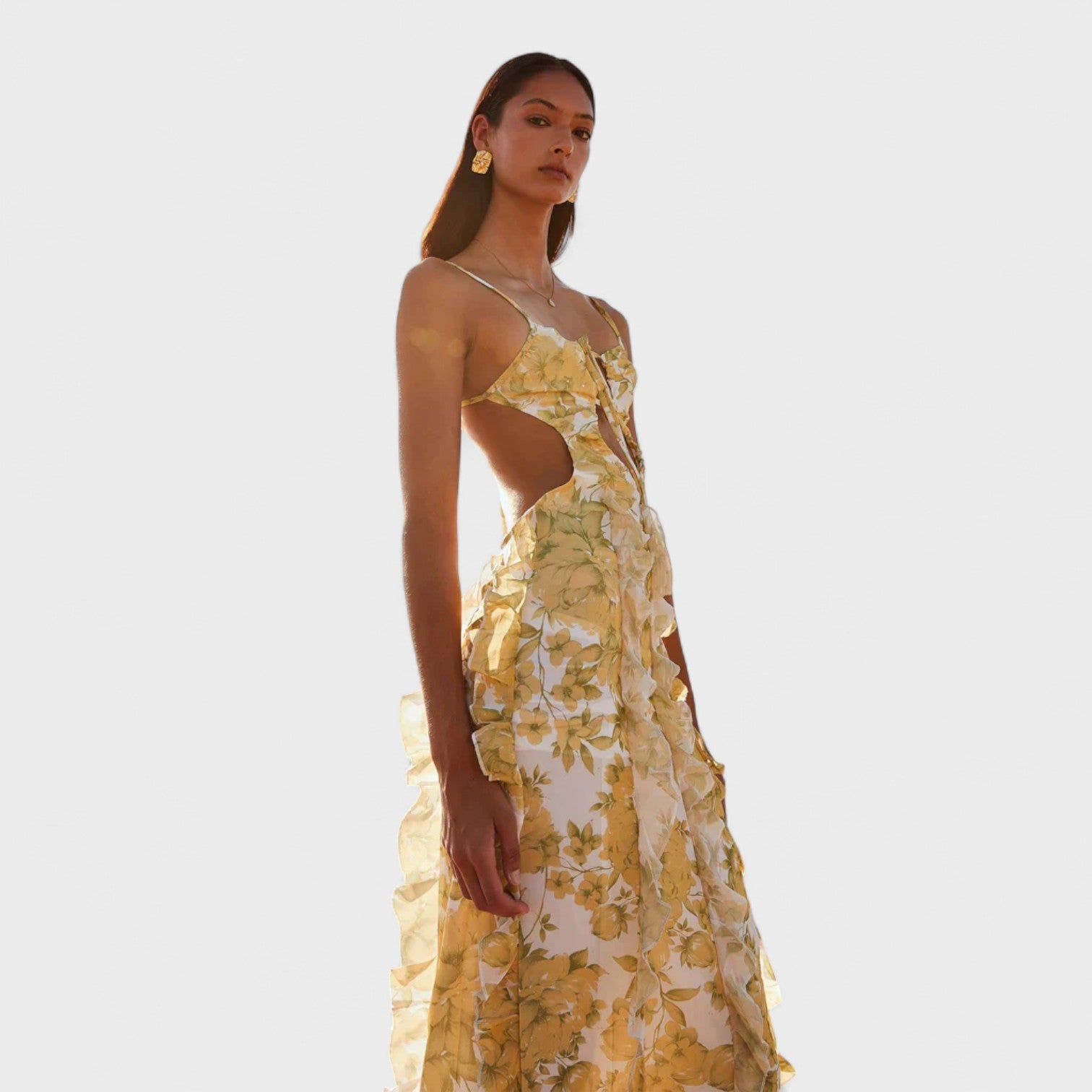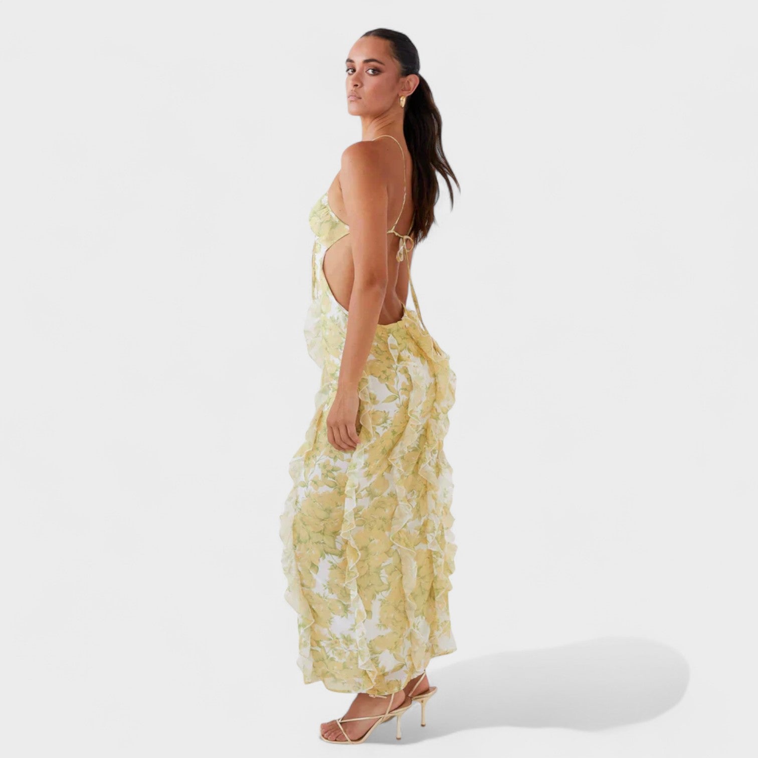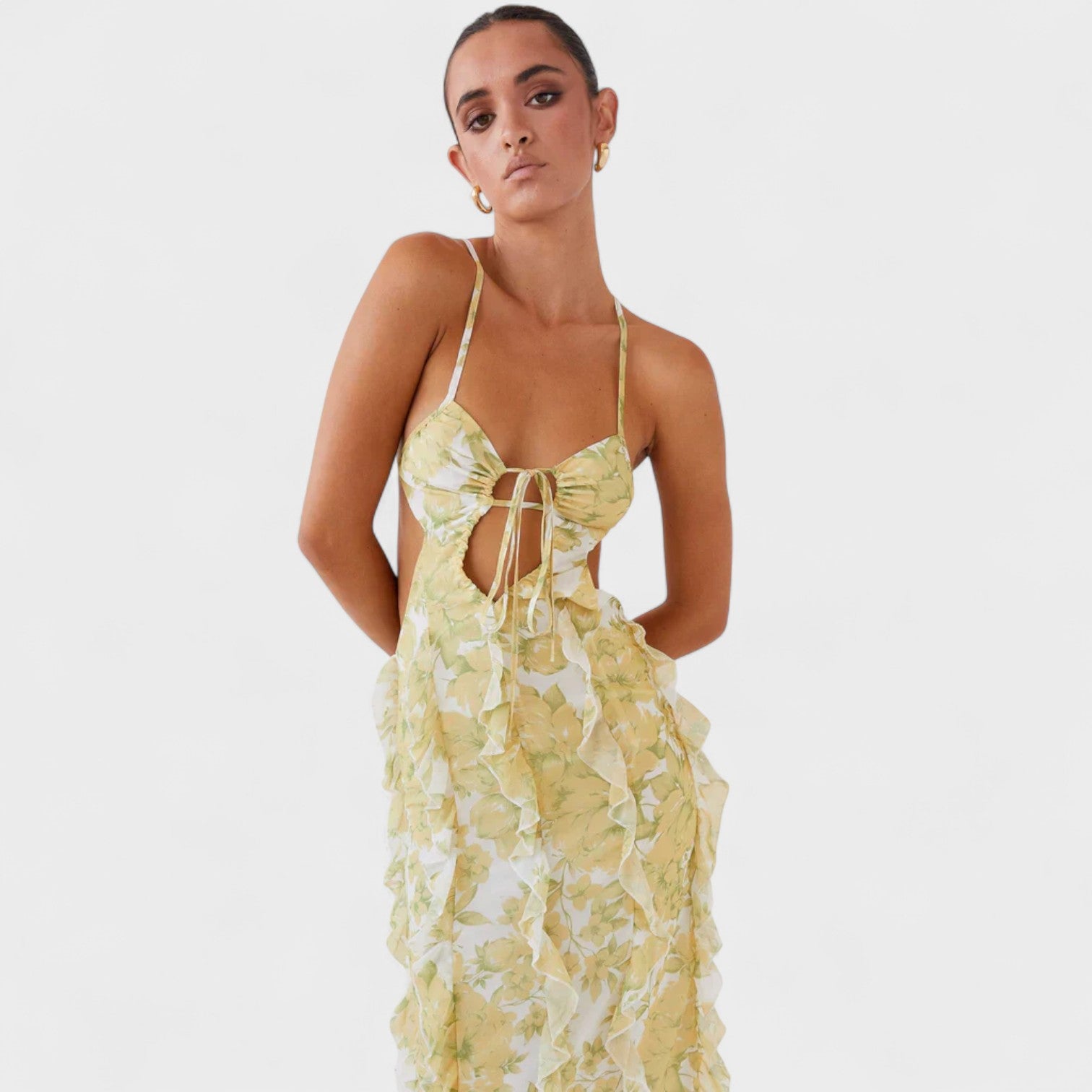 Con un diseño que baila con cada paso, el vestido Sunset Kisses transforma tu silueta en pura poesía visual. Su escote halter ajustable, espalda descubierta y capas de volantes flotantes lo convierten en el protagonista de cualquier puesta de sol.